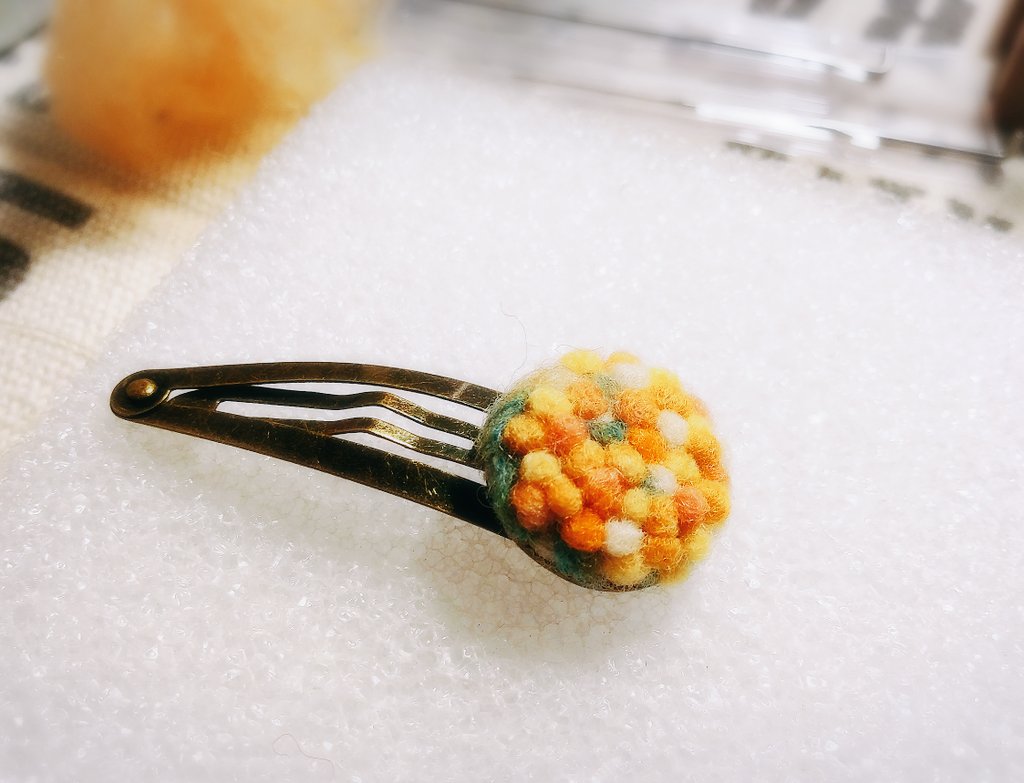 ヘアピンの在庫がなくなりそうなので追加でチクチク…✨ ミモザをイメージ😊 春らしい雰囲気でてるかな? #羊毛フェルト