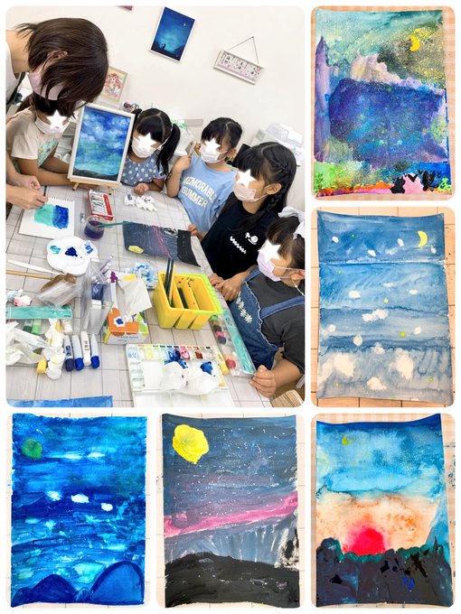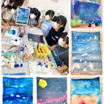 1 13 絵画教室、無事終了しました。9月のテーマは「星空」。水彩絵の具を使ってみんな素敵に仕上げてくれました。みんな違ってみんないい!それぞれ絵の具を絞り出すパレットを見ているとこちらもワクワクしてきます。楽しんでもらえて嬉しい。感謝✨ 次回は17日です。😊🎨 #絵画教室 #水彩画 #星空 22/09/03 19:27