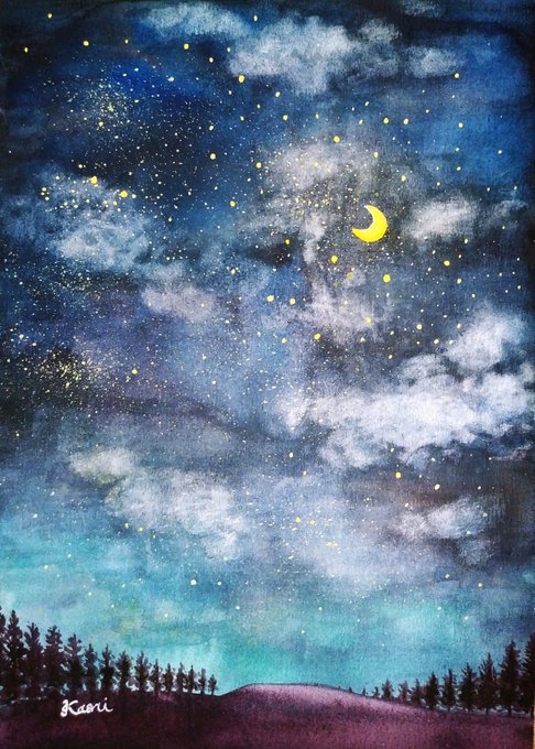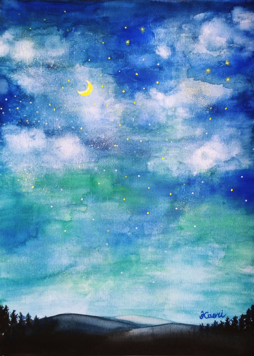 左がホルベインで、右がぺんてる。個人的には値段は3倍高いけれどホルベインの方が好き。(でももうちょっとお財布に優しいと嬉しい😂)ムラになりにくい気がする。絵画教室に来てくれた子ども達、みんな慎重で雲の白抜きの方法に手こずってたなぁ。初めてだもんね。ドキドキするよね。 #水彩画 #夜空