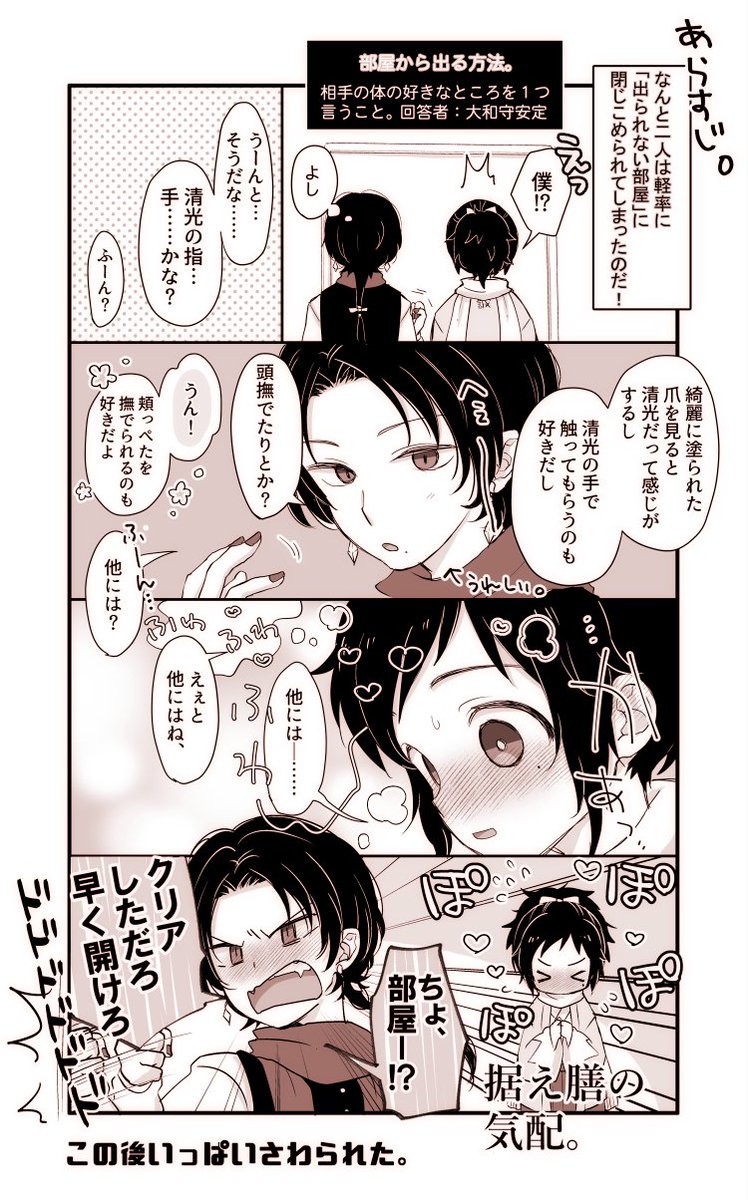 35 368 【禁止/解禁】 今日は清光が重い物を持ってくれたりして、 なんだかすごく優しかったなぁ。 (大和守安定の日記より) #清安ワンドロ (@kiyoyasu_60min) 22/11/19 23:57