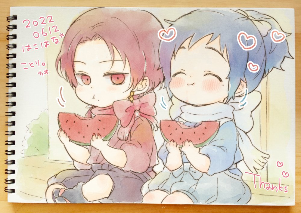 55 368 大遅刻のスケブ描けました🙌 【ちったい清光と安定くんの夏休み】 清「口のまわりすいかだらけじゃんも~」 安「きよみつ!すいかおいしいね…!🍉🌸」 ありがとうございました!🥳❤️💙✨ #エアスケブ 22/06/18 23:11