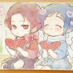 大遅刻のスケブ描けました🙌 【ちったい清光と安定くんの夏休み】 清「口のまわりすいかだらけじゃんも~」 安「きよみつ!すいかおいしいね…!🍉🌸」 ありがとうございました!🥳❤️💙✨ #エアスケブ
