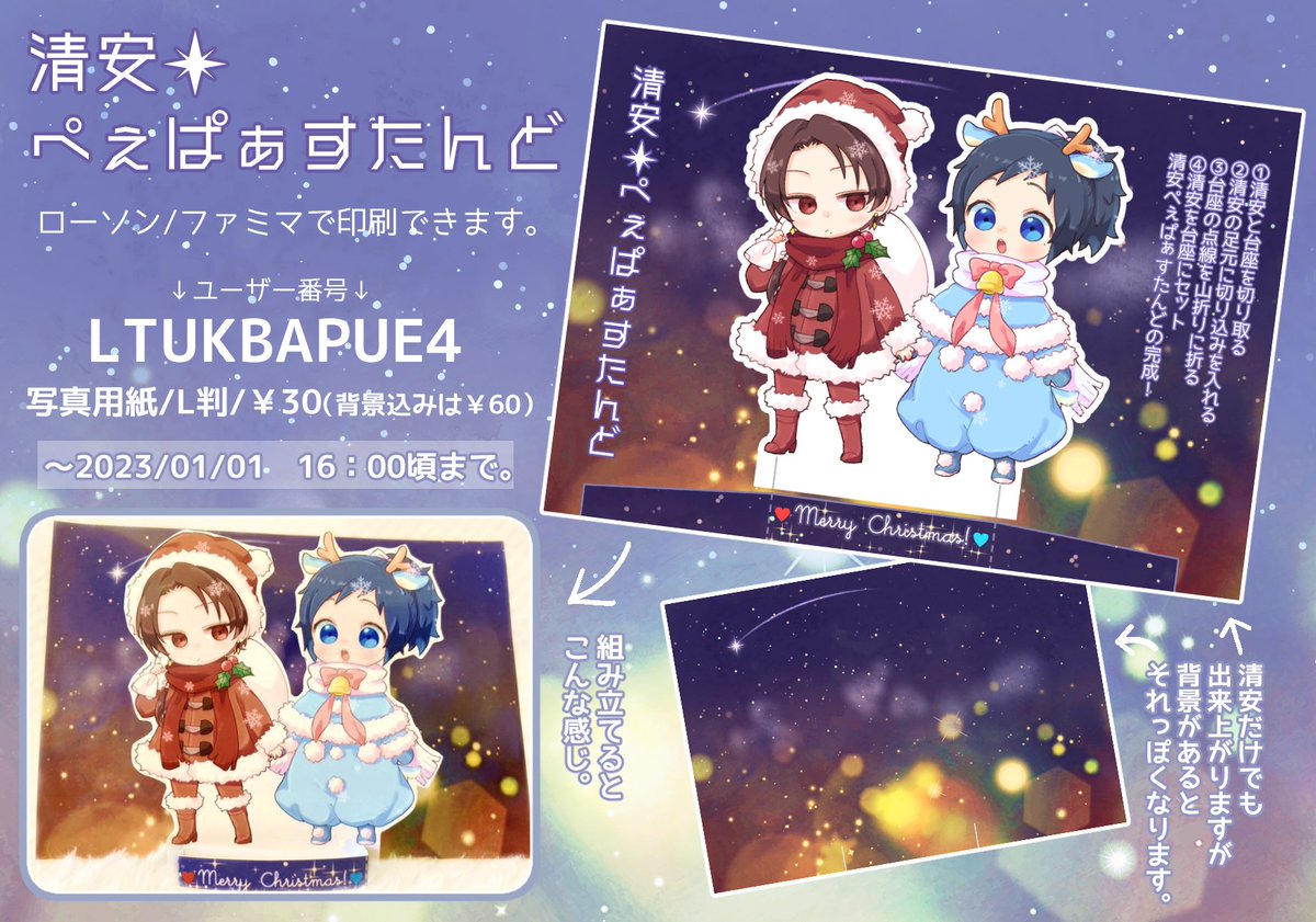 清安💮ぺぇぱぁすたんど(おてて繋ぎVer.)をネットプリント登録しました!よければ印刷したり遊んだりしてください~🥳清安のみでも背景ありでも楽しめます💫 印刷既刊は2023/1/1 16時頃までです! ハッピー清安クリスマス✨❤️🎄💙✨
