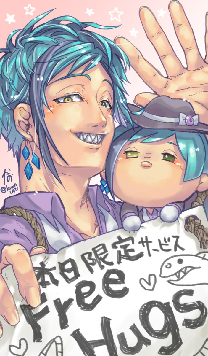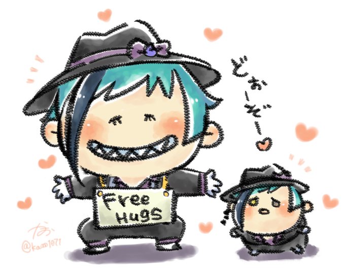 🐙「今年もアレやっているんですか…」 🐬「昨夜、張り切って準備してましたから😊」 🐙「集客になるなら良いですが、くれぐれも怪我人は出さないでくださいね」 というわけでハグの日〜🤗✨今年もイラスト描いたよ〜💪 #twstファンアート #ツイステファンアート