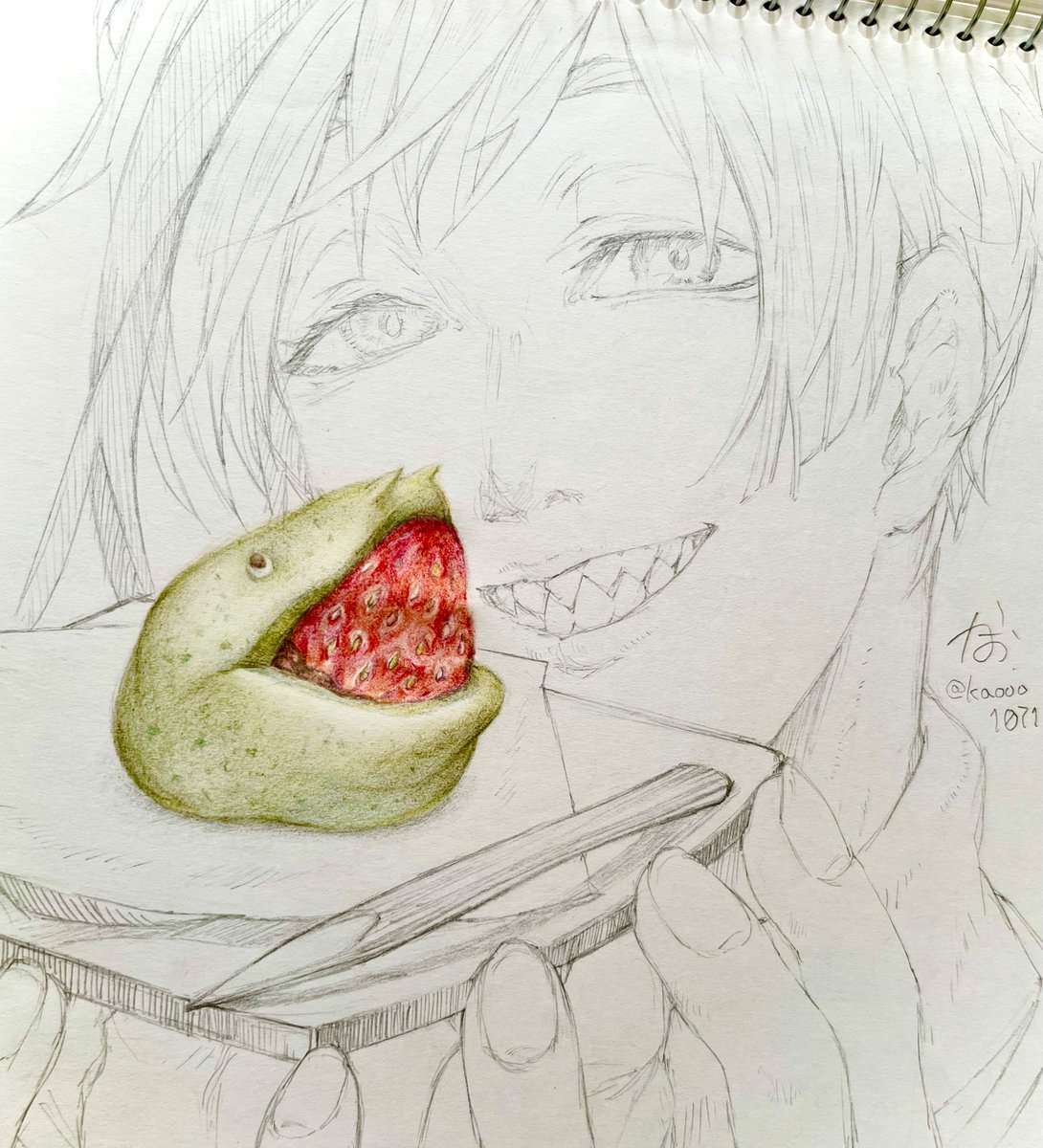 先日の"いちごの日(1月5日)"に描いたrkgkなんだけど、アップし損ねたので本日15日(いちご)にかけて供養させてください🙇♀️ #ツイステファンアート 🦈「こういう形の苺大福見ると顔を付け加えたくなるよねぇ〜」