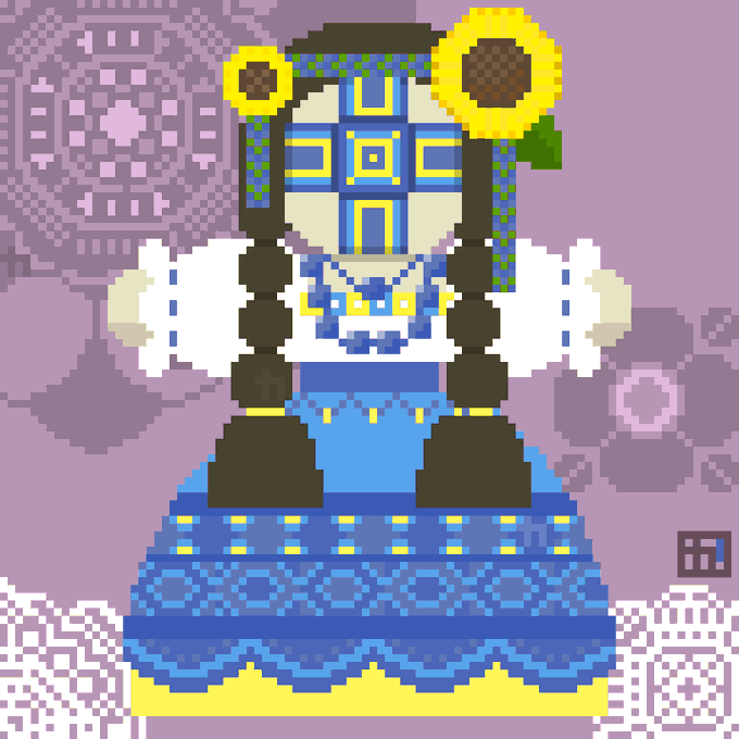 🇺🇦モタンカ《お守り人形》 顔の十字架は太陽神のサイン。祖母や母の服布で作るそう。本来は伝統的な刺繍柄なんだけどオリジナルで。 色んなデザインがあってまた描きたくなるモチーフです👓 災いから守ってくれるように🙏 #pixelart #8bitpainter #digitalart #ドット絵 #Ukraine️