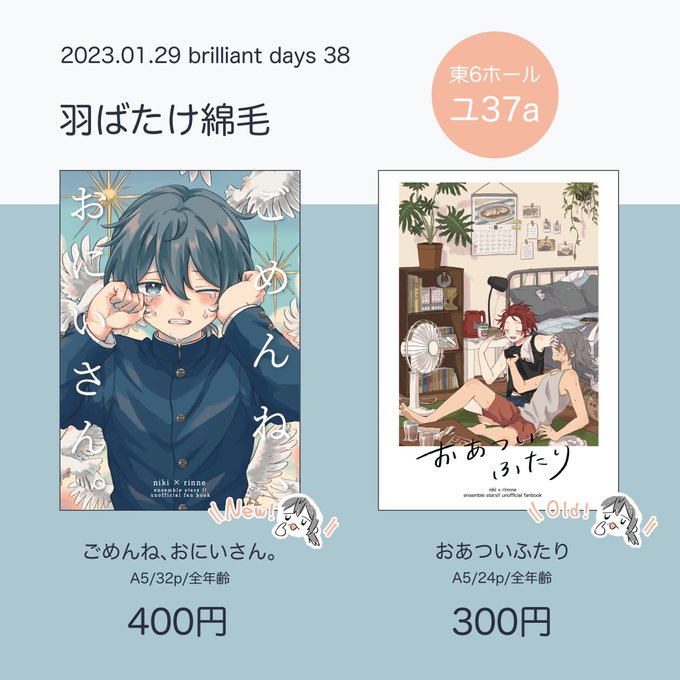 【1/29 ブリデ38 お品書き】 ニキ燐の新刊、既刊どっちもあります! ▼新刊サンプル pixiv.net/artworks/10480… ▼既刊サンプル pixiv.net/artworks/10098…