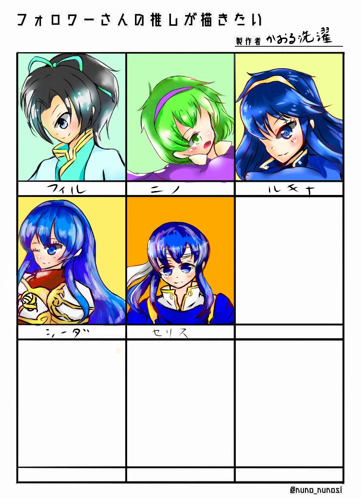 #フォロワーさんの推しが描きたい @FEH21301621 フィル @toridango_fe ニノ @ririsu_pink ルキナ @nachtritter1 シーダ @azchemist63 セリス 遅くなりました… まだ枠が空いているので よかったら お願いします(^-^)