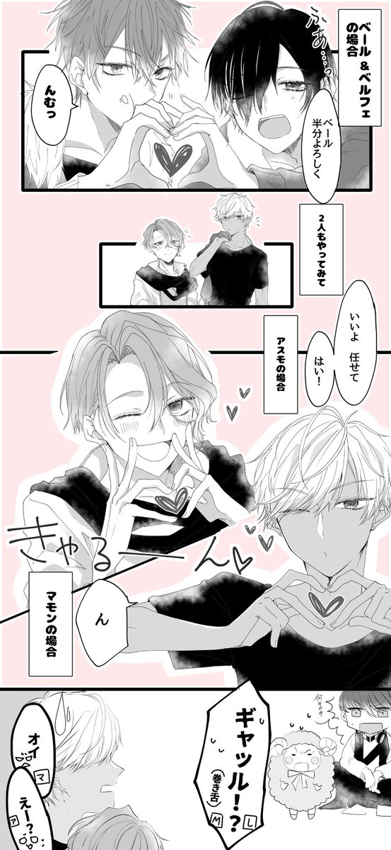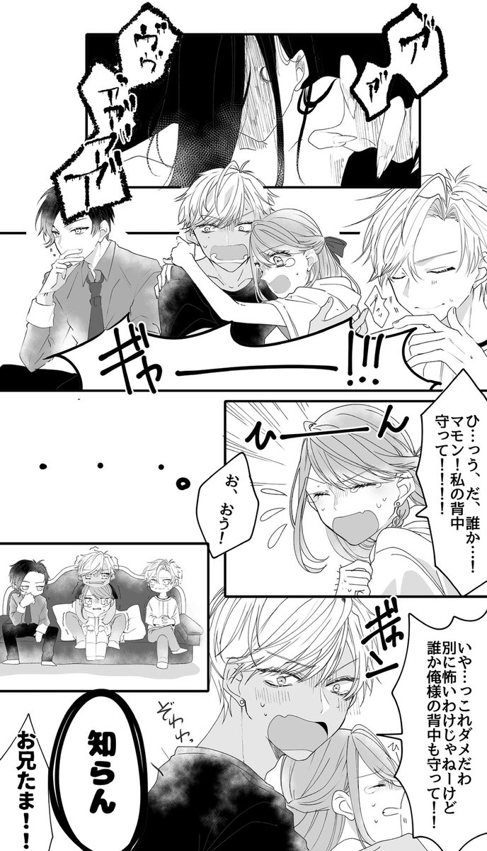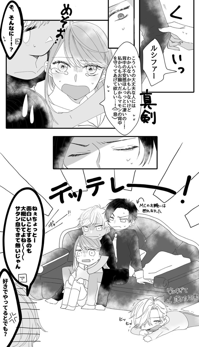 ホラー見てる時の背中の不安感 もともとルシファーとサタンはホラーを見て怖がるマモンの反応を楽しんでたけど、そこにMCが加わって楽しみが倍増したから、上映会の回数が地味に増えてたら私がにっこりする ⚠️妄想書き殴り。マモン×MC要素あり 創作MC顔出てるし喋る #obmプラス #obeymefanart
