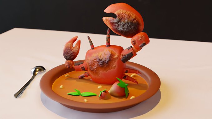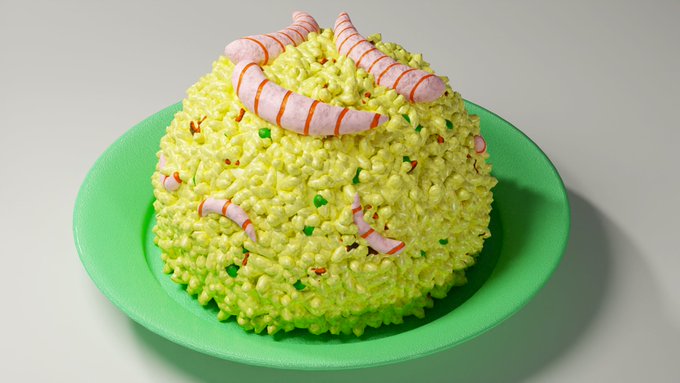 マテリアルを含めてエビの表現がむずい。カーブとキューブで形作った方がよさそう? 九日目「海鮮チャーハン」 #100日チャレンジ #ブレスオブザワイルド #blender初心者 #blender #b3d #3DCG