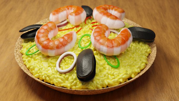 エビの形は前回よりもマシになったし、マテリアルもまぁまぁ。頂点数がえげちぃことになったけど大方満足! 十日目「海鮮パエリア」 #100日チャレンジ #ブレスオブザワイルド #blender初心者 #blender #b3d #3DCG