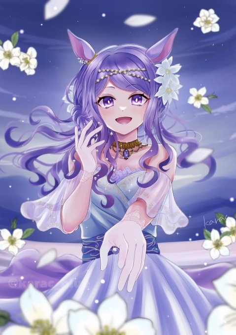 #フォロワーさんからイメージもらって自分をウマ娘化する 「淀競においでやす~~💜」 由緒ある一族のお嬢様で、自宅でお茶会するのが好き あと幸福を呼ぶ蝙蝠も好き 主に京都競馬場で活躍してる みたいな感じで…… エプロンの下は袴風スカートです いただいたイメージはリプに繋げておきます💜