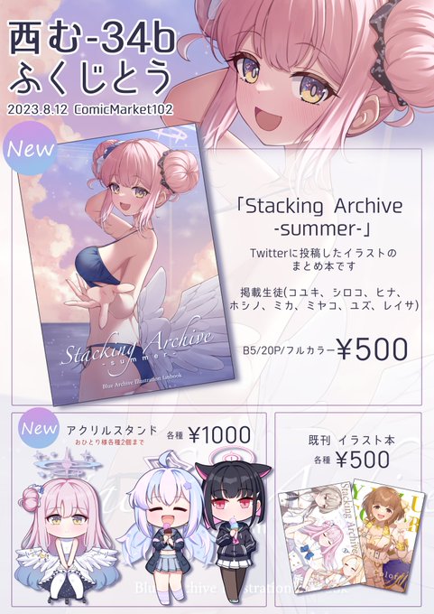 夏コミのお品書きです! ブルアカのイラストまとめ本とアクスタを持っていきます! 新刊はメロンブックスさんで予約受付中です よろしくお願いします! #C102 #C102お品書き
