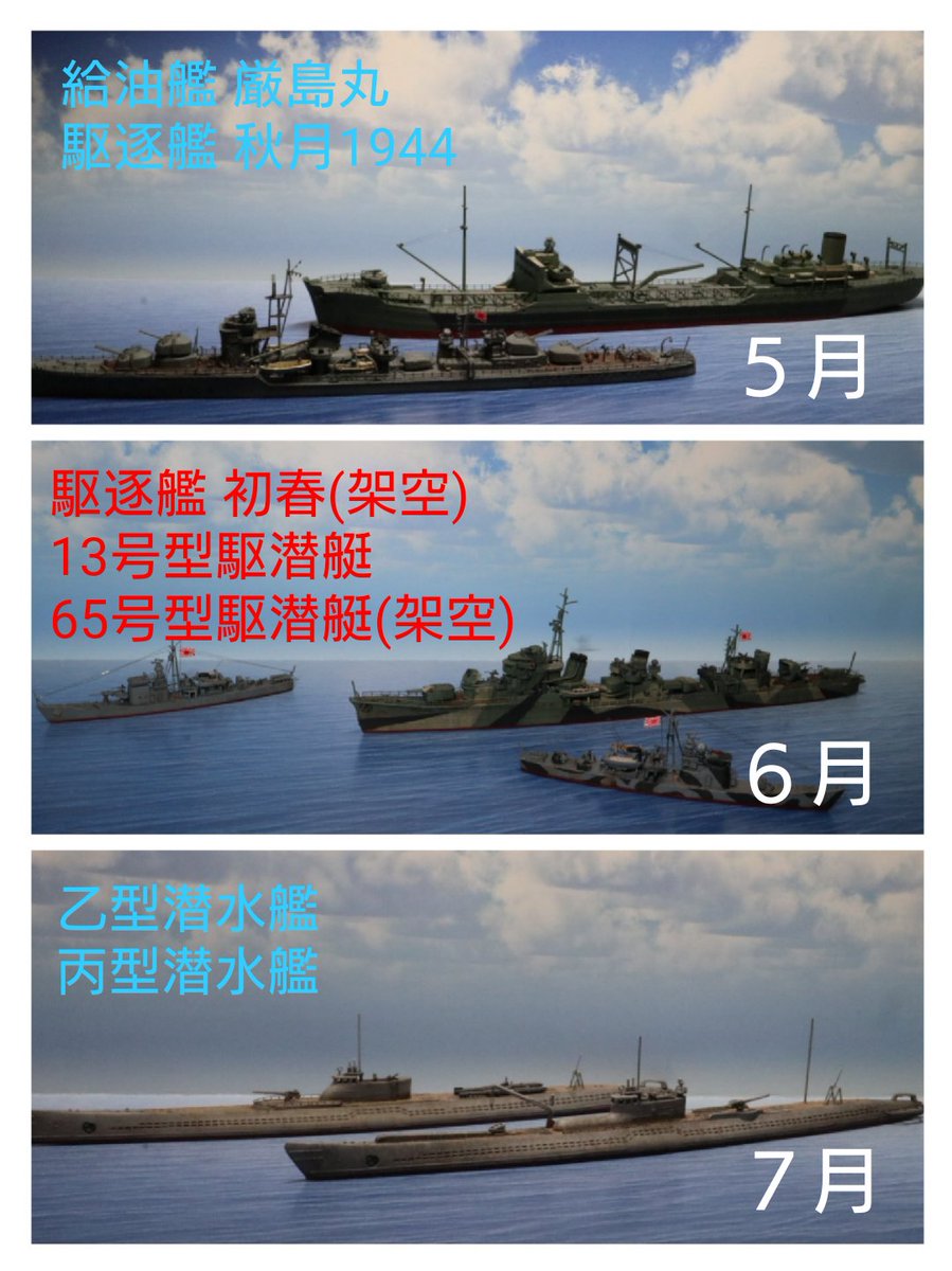 #今年作ったプラモ晒そうぜ 忘れそうなので今日やっておきますw 奥から、 駆逐艦 夕月 海防艦 占守 国後 一等輸送艦 第9号