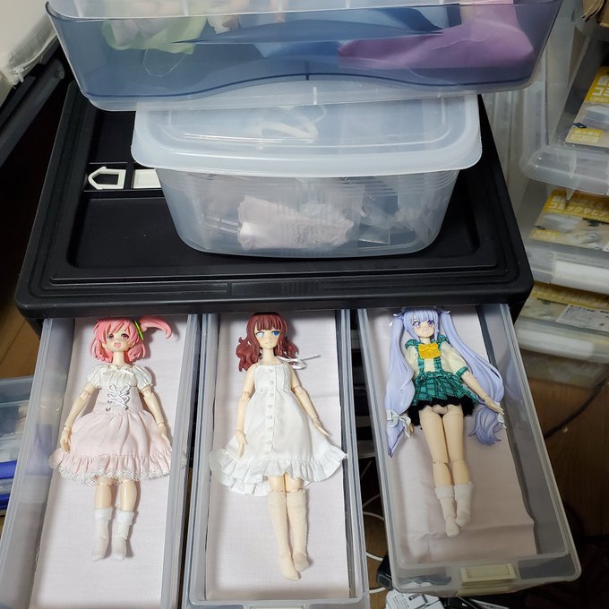 リリィを保管するケースを新しく買った。下段は広くなってるからミリアムも入るだろう。叶星様は髪の関係で高さ足りないだろうな。余裕をもって入る子だけ。擦れて塗料剥げてるリリィが二人いる故 #アサルトリリィドール部