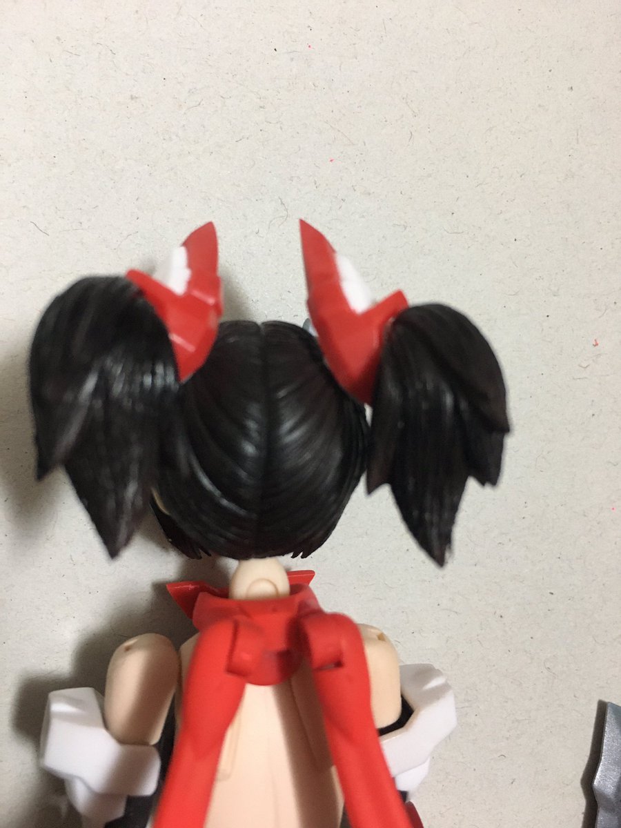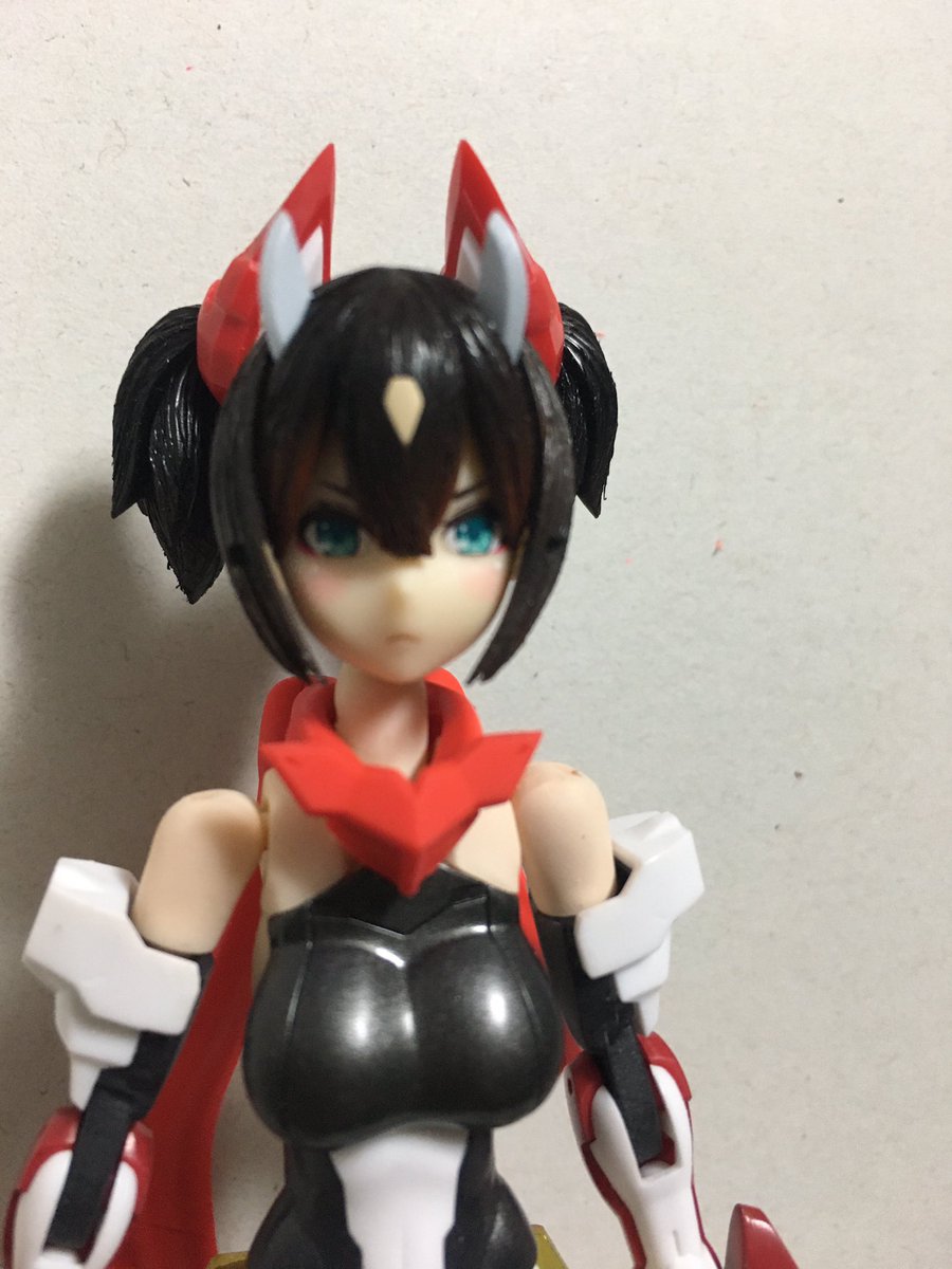 朱羅 忍者 髪の毛の塗装と頭部の髪留め以外の赤部分を表面処理をして再度塗装しました 髪の毛は黒から茶色にグラデーションをかけましたが画像では色が飛んでます おでこのパーツはもう少し主張するよう塗り直し予定です #コトブキヤ #メガミデバイス #朱羅