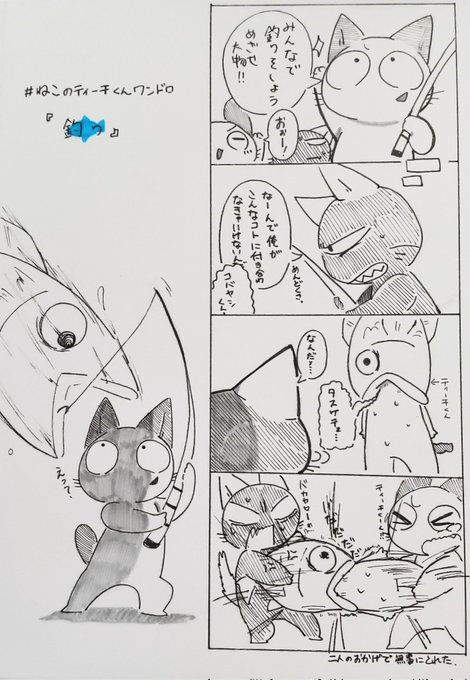 #ねこのティーチくんワンドロ お題【⠀釣り 】 制作時間:1時間 今回は四コママンガ的なやつ さかさか描いたから雑さがすごい