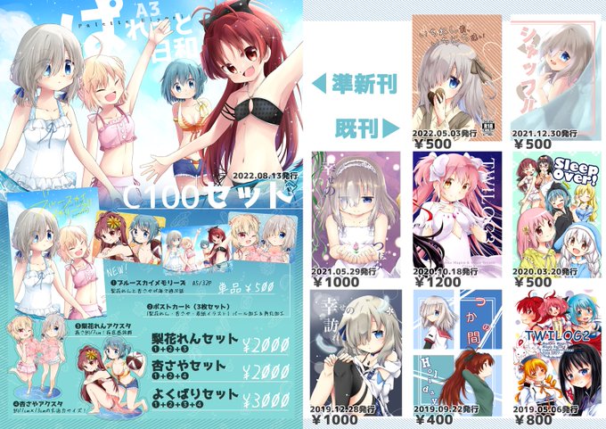 65 137 #プリレコ9 ぱれっと日和A-3のお品書きです! 今回本の新作はC100で頒布した準新刊のみとなります。グッズの新作をたくさん作りました。よければ遊びにきてください!フレークシール1と2は以前と同じものですが3種類に増えたので全てパッケージ化しました。 既刊は在庫少なめです。 22/10/16 20:05