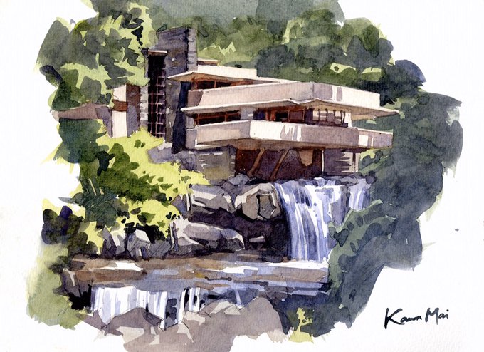 In October, we’ll have a live online workshop on textures (stone, glass, metal, etc.) in architectural sketches. Message for details.😊 #fallingwater #watercolor #watercolorpainting #travelsketch #watercolorsketch #hkartist #hkillustrator #水彩 #建築 #速寫 #일러스트 #수채화