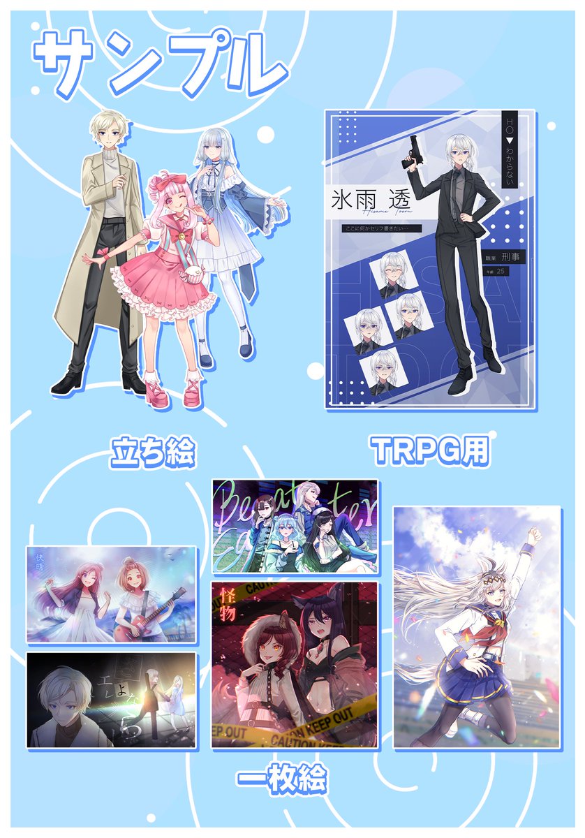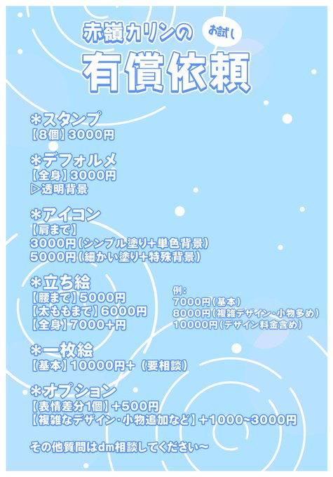 赤嶺カリンの(お試し)有償依頼!🐟 有償依頼の料金表・説明・サンプルになります〜 受付状況はプロフ欄見てください。 〈○=受付中、△=要相談、×=今受け付けません〉 リプツリーではサンプルの大きい画像や特別オファーなど載せます。 ✬ #イラスト依頼 #有償依頼 #有償依頼受付中