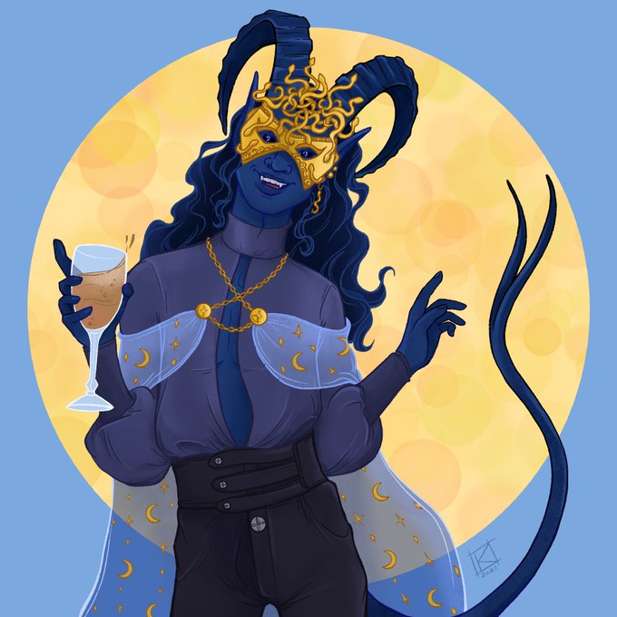 Thinking about critical role and got excited about the characters in their masquerade outfits! Realized I never posted this boy here from our own masquerade party! Tarek loved getting to dress up and got a little drunk oops #DnDcharacter #originalcharacter #tiefling #dndart