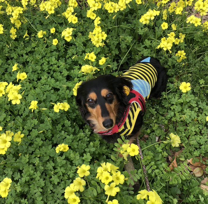 6 166 ぶ〜んぶ〜ん🐝🐝🐝🌬🌬🌬 フェル隊員🐝🐶 お山をパトロール⛰ 可愛いお花を🌼 たくさん見つけたよ〜👀🌼🌼 ハチミツあるかなぁ🐝🏺🐻 #ぶんぶん隊 #山散歩 #ミニチュアダックス #いぬんぽ #コスプレ 21/03/21 11:10