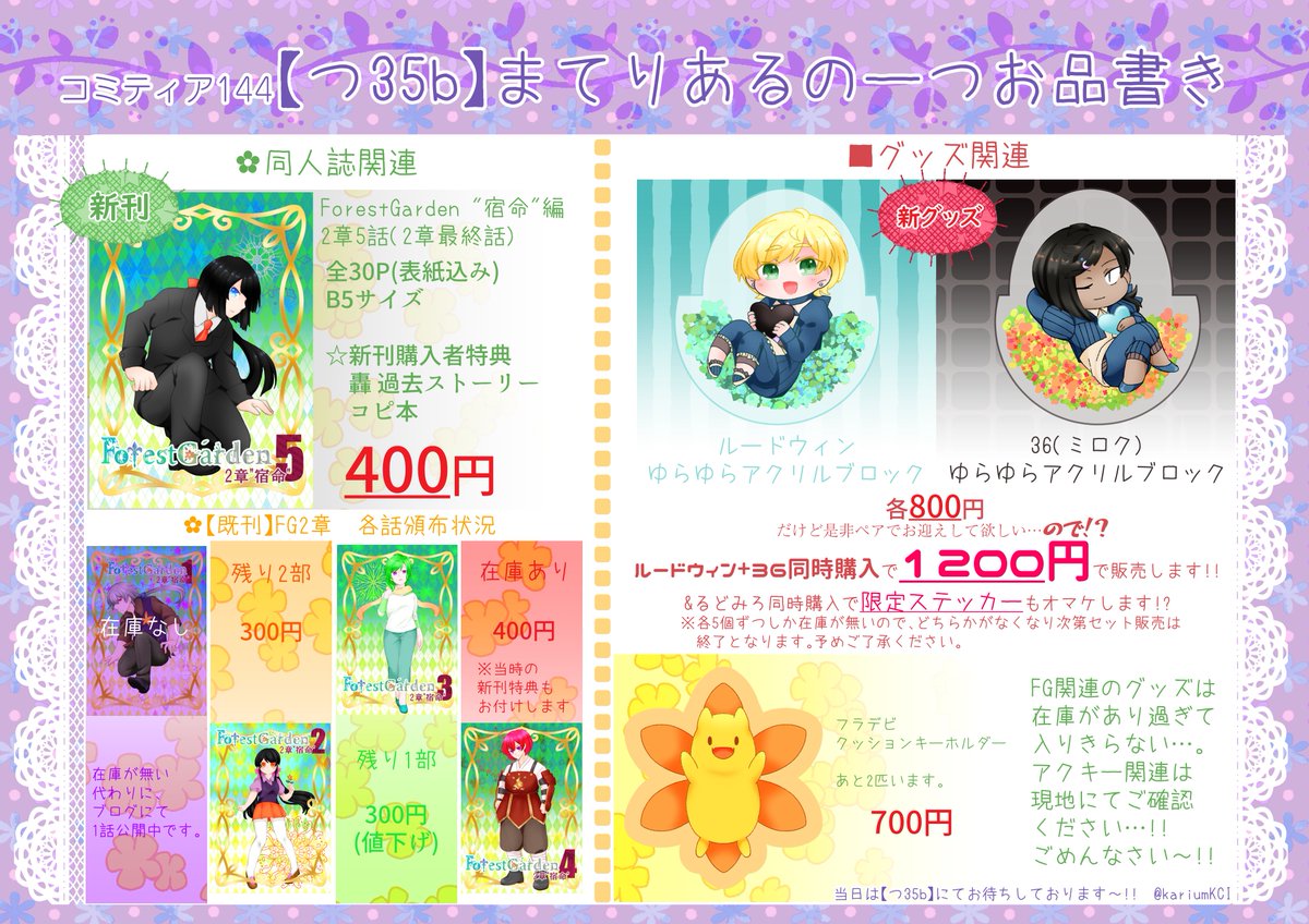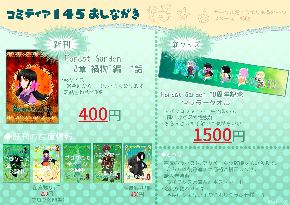 #コミティア145 #COMITIA145 こちらお品書きです!! 今回は新刊とグッズは1つずつになります。 在庫もいくつか持っていきます~!! 9月はまだアチアチだからこんなお品書きでも許される、ハズ。