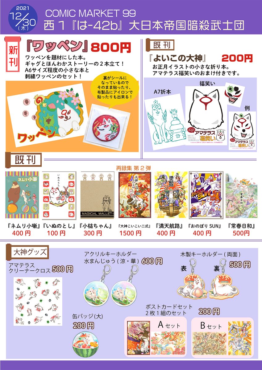 9 14 設営終わりました! 西1ホール は42b 大日本帝国暗殺武士団 状況次第ですが、終了ギリギリまでいる予定ですので、良ければお立ち寄りください! 大神 新刊あります! #C99 #コミックマーケット99 21/12/30 11:34