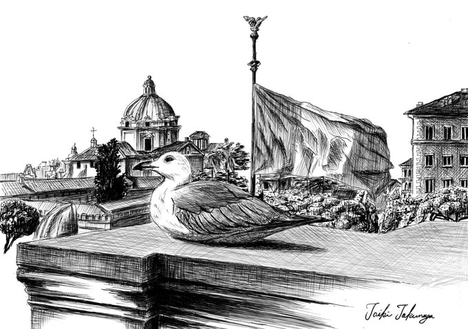 (過去絵の説明) 「葛藤」 自分には合わないと分かりながらも、言われた通りの生き方をするか(左)、自分の気持ちに正直に生きるか(右)。 〈立札〉 Civitas..ラテン語で「文明」の意。 Málaga..ピカソの出生地。 (リプ欄へ続く…) #絵描きさんと繋がりたい