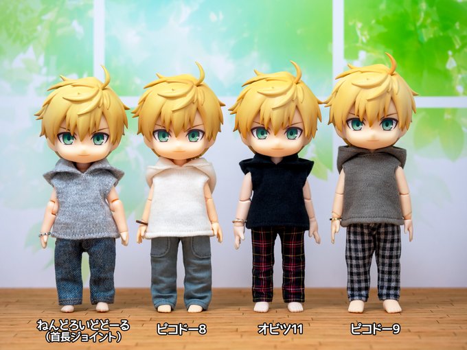 【ボディ11種の背比べ】 我が家にあるボディ11種を比較してみました。 1枚目はピコドー8を除く10種を背の順で並べての比較。 2枚目はYmY幼ボディを除く小さい系6種、3枚目は大きい系4種にそれぞれ同じ服・小物を着用させての比較です。 #ねんどろいどカルデア