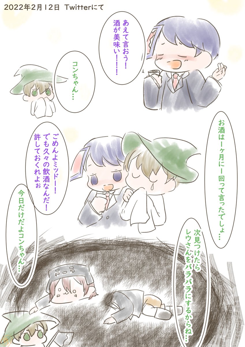 4 34 昨日~今日のついったでのやりとりが面白かったのでw #コンてすと #強く生きろレウクラ #緑色さんご自由にどうぞ 果たしてこんちゃんは酒が飲めるのか、そしてレウさんの運命やいかに!?w 22/02/13 14:38