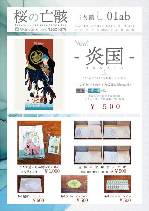 2023/08/20 SUPER COMIC CITY 関西 29 超閃華の刻 2023夏 5号館 し01ab〚桜の亡骸〛 【お品書き】 〘新刊〙-炎国- 上 ▼Sample pixiv.net/artworks/11081… 〘グッズ〙 ・どこで迷ったか聞いてくれるいち兄アクキー ・近侍申す申すメモ帖 ・Ao3 撥水サコッシュ/ラバーコインケース/チケットファイル
