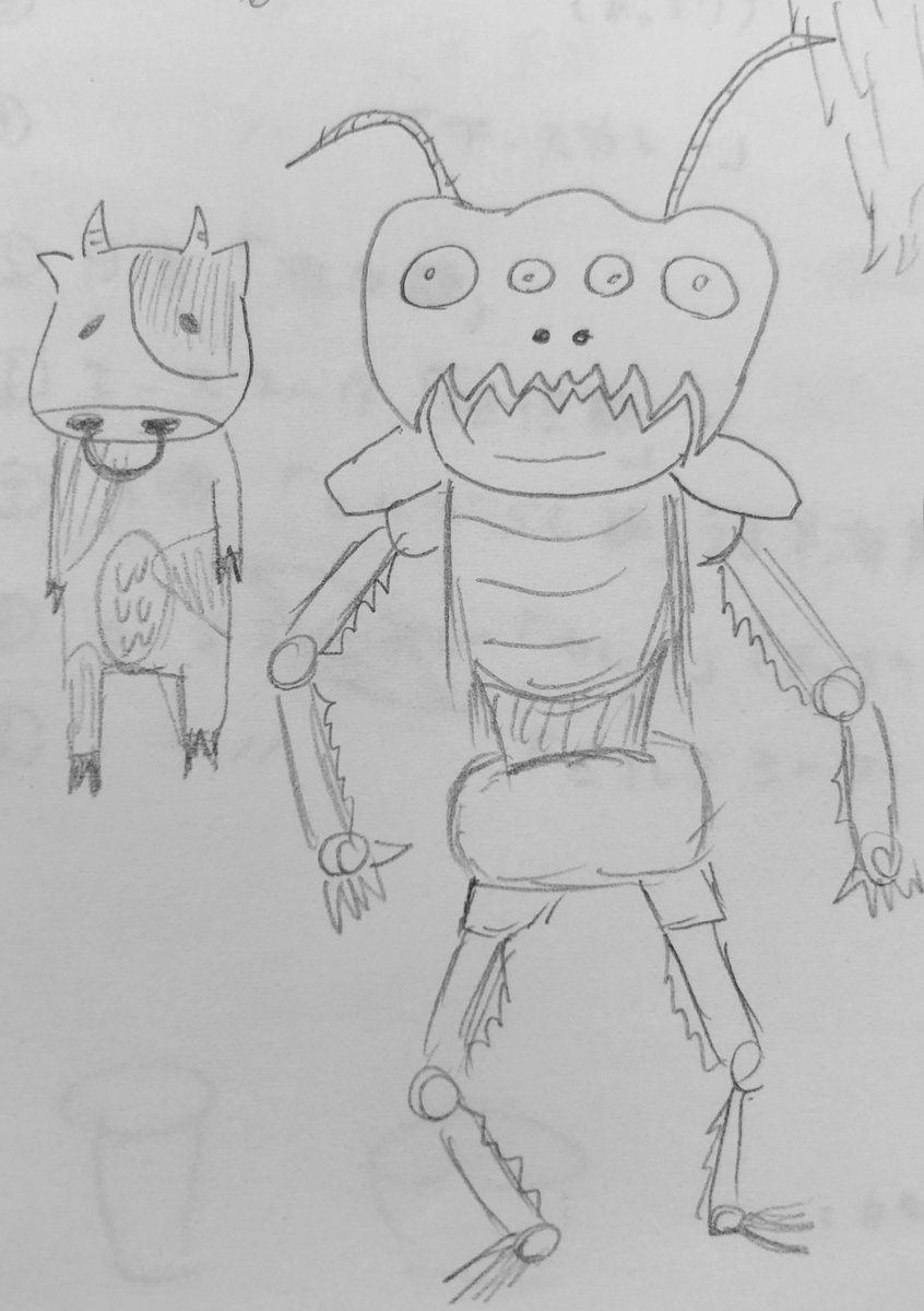 左の牛と、右のモンスターの絵柄違いすぎるw ほんとに自分の絵柄?が分からん☹️ #今日の落書き #イラスト