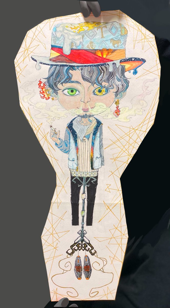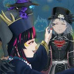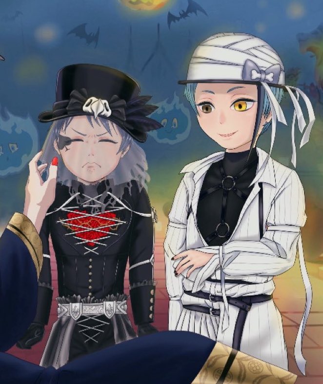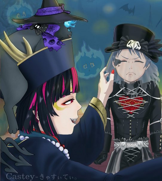 スケアリードレスの細部まで 描いてみようと頑張りました🎩 ♠️くんと🐬くんを 迷子で子ども化したのと、 3人画面に入れるのは初挑戦と 思われまして… スマホに滑らせる指が 燃えるかと思いました…🔥 たのしかったです✨🧚🏿♀️ #ツイステハロウィーン #ツイステファンアート