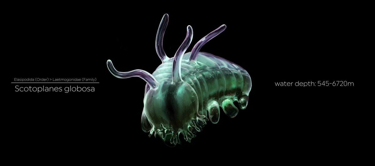 [No.1 ] Scotoplanes globosa(センジュナマコ) 超深海底にも生息する種。3対の触覚のようなものが特徴的。 #イラスト #illustration #illust #深海 #deepsea