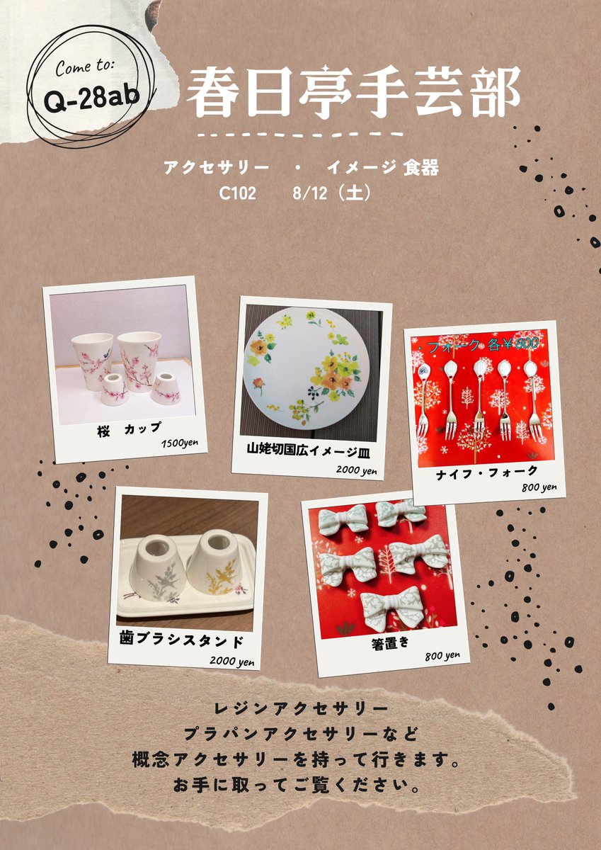 【お品書き】C102 1日目 ◆東2 Q 28ab 春日亭◆ ちょぎさに新刊、ノベルティのバゲージタグ、既刊と手芸部の食器、アクセサリーも頒布します。 よろしくお願いします✨ 🔹新刊サンプル pixiv.net/artworks/11071… 🔸通販 🐯ecs.toranoana.jp/joshi/ec/item/…