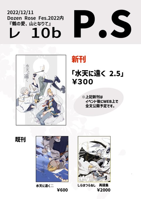 2022/12/11 Dozen Rose Fes .2022 東6ホール レ10b 「P.S」 新刊1冊と既刊をいくつか持ち込み予定です。 新刊は後日WEB上で全文公開予定ですので、ご注意ください。冊子でお迎えしてくださる方はお手に取っていただけると嬉しいです!