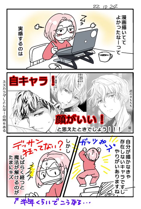 そういえば課題再掲だけど、これを見ると萌え型だなーって思いますね 作画案件めちゃめちゃ楽しんでるのって「わー!かっこいい!素敵ー!」って思いながら描けているからなのかも (まさに自画自賛) 改善点や足りないところの自覚、研究はしながら基本自分の絵大好きです #コルクラボマンガ専科