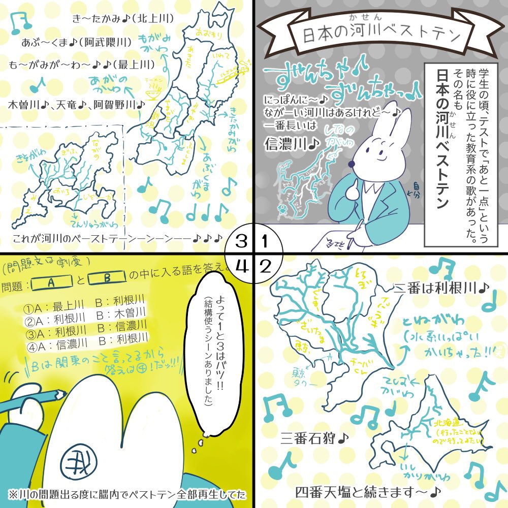 テストあと一点の時に使ってた歌🎶 今回描いて水系っていっぱいあるなあと思った☺️ 消去法の時結構重宝した思い出。実際ベストファイブまでで充分だったと思うけど。他には日本史も歌で覚えてた派でした!👀 #漫画が読めるハッシュタグ #エッセイ漫画