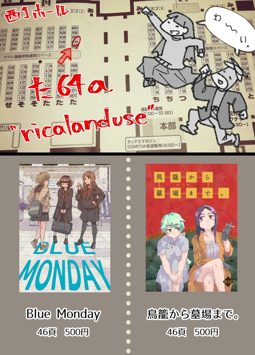 10 19 明日のCOMITIA。新刊は無いです!『Blue Monday』の製本バージョンと既刊『鳥籠から墓場まで。』の再販です!新刊は!無いです!ごめん! 19/02/16 13:40