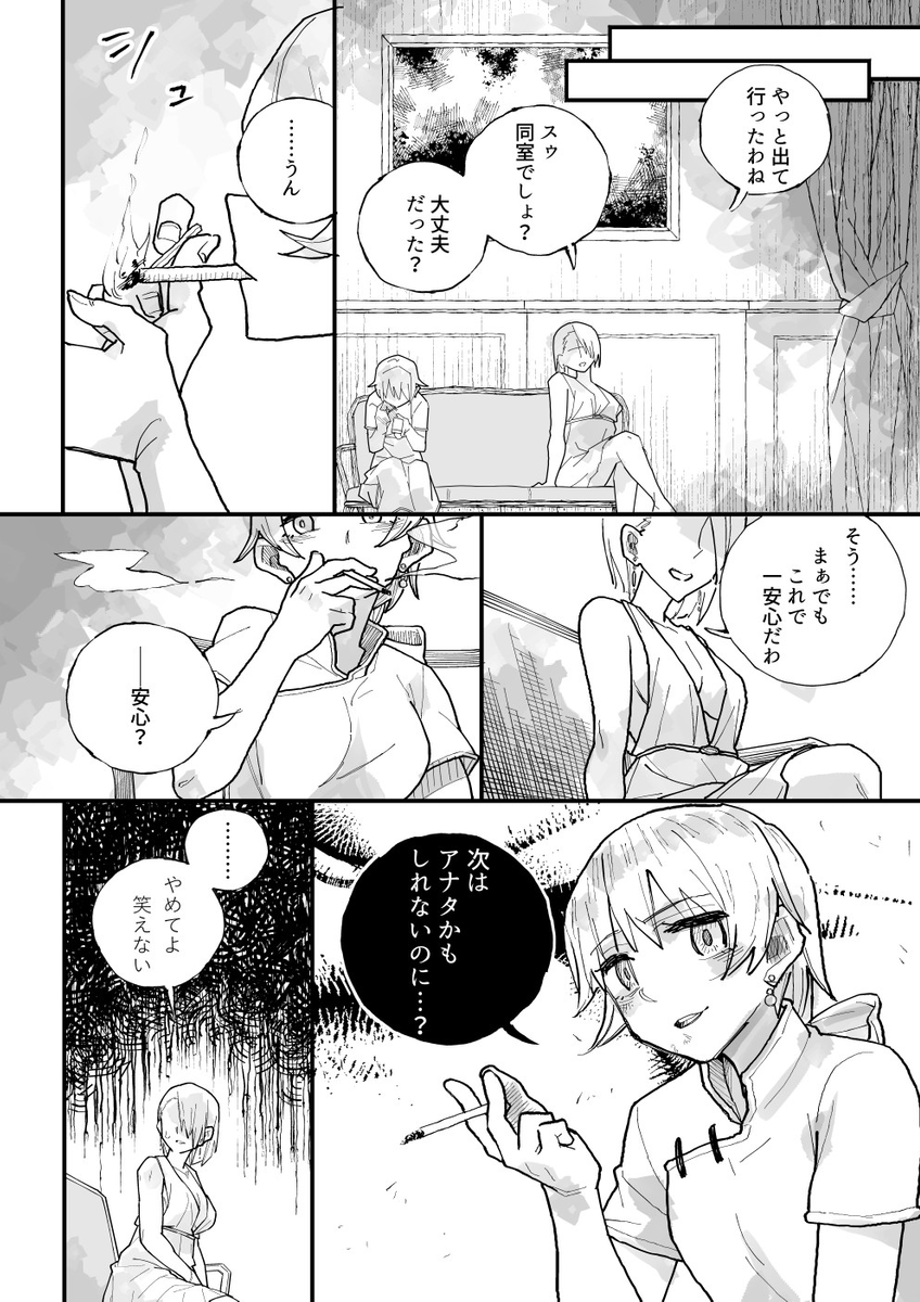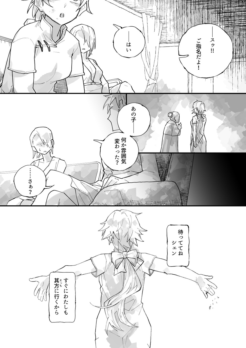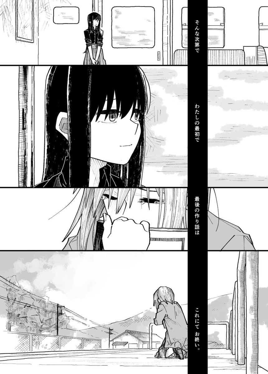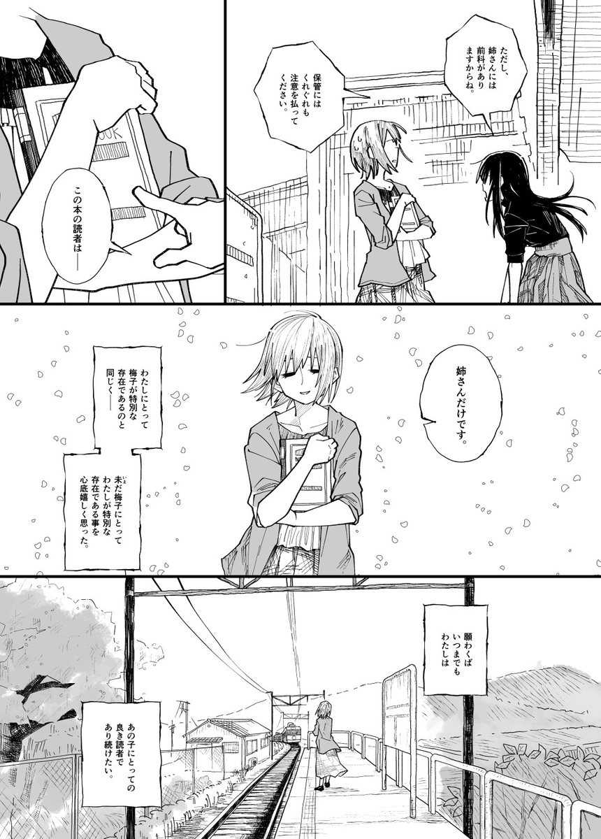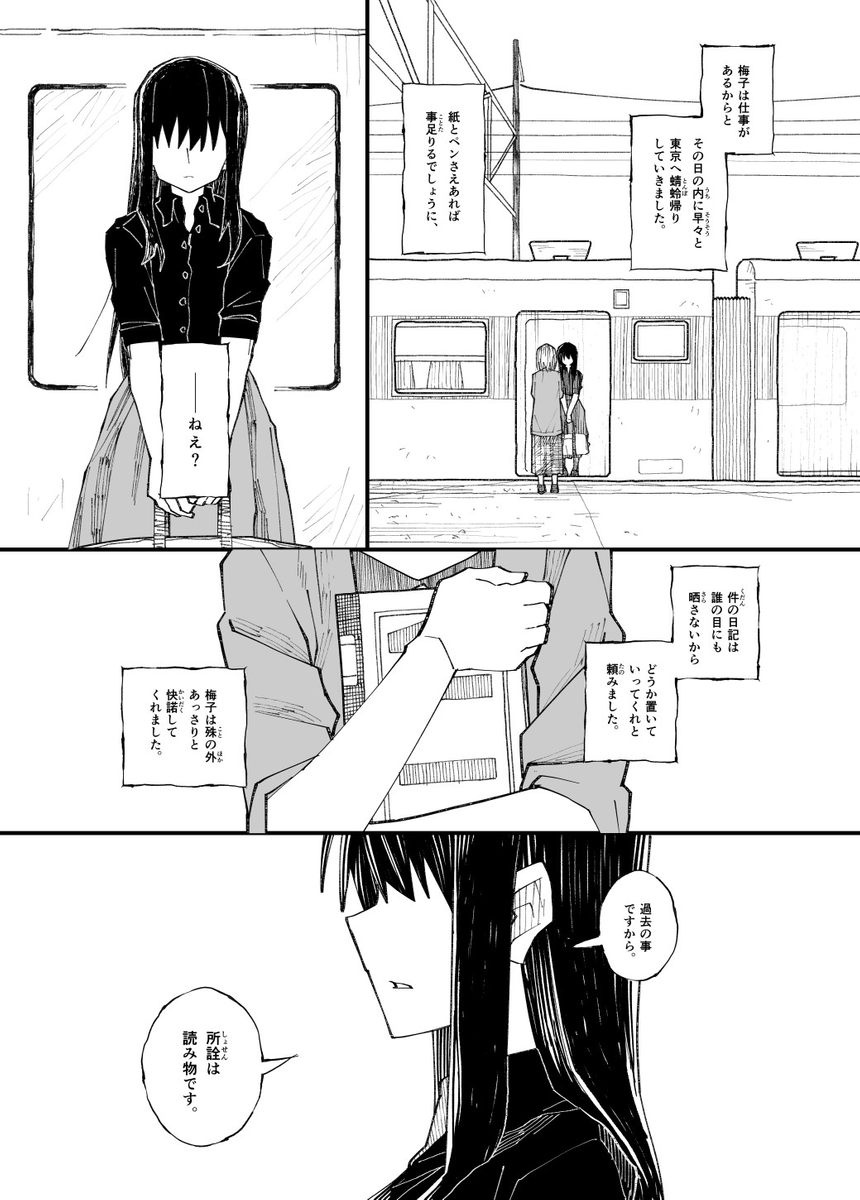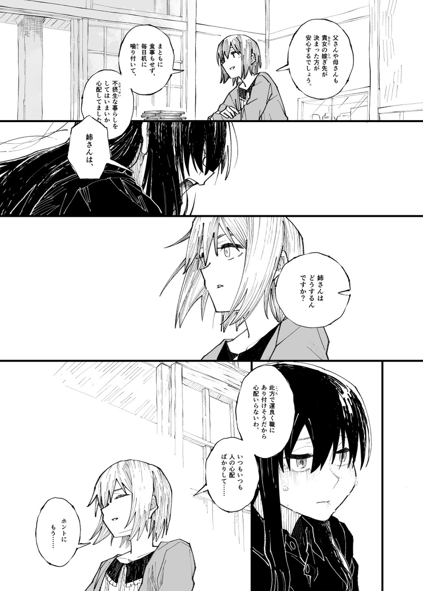 まぁ姉妹の~‥なんだろ‥‥すれ違い的な?‥‥わからん。芥川の『秋』と尾崎翠の『無風帯から』を混ぜた感じ?ってノリで描いてました。字が小さいね。 (1/12)