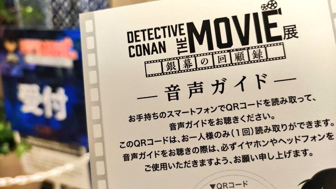 ムービー展の音声ガイド購入者は、くれぐれもイヤホンをお忘れなきよう! また、会場内には“音”があるので、本当にクリアに聞きたい方は、場合によってはヘッドホンでも良いかもしれません。私はコナン君のワイヤレスイヤホンをたまたま持参していたのでそれで聞けました。 #コナンムービー展