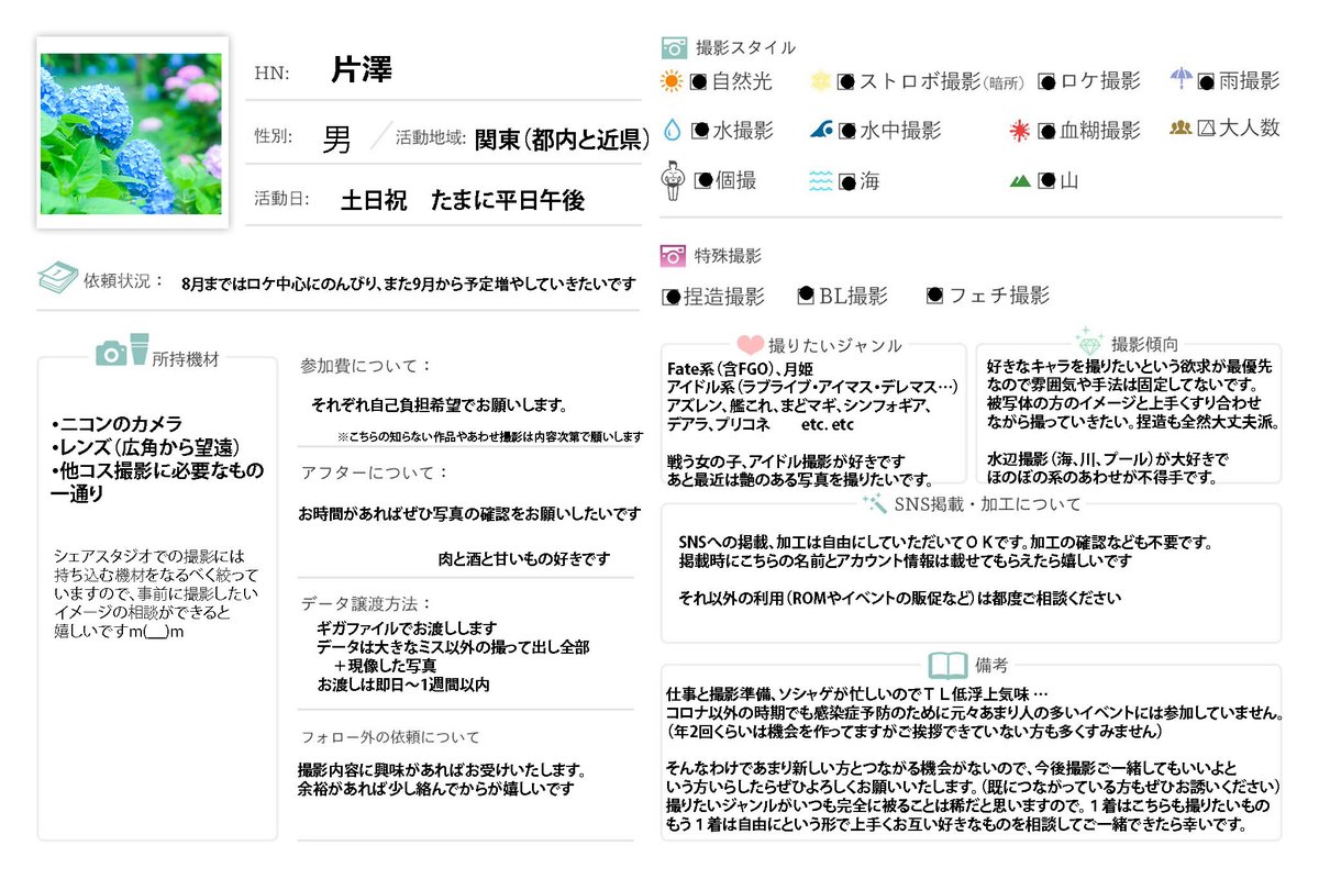 関東で活動している📷です レイヤーさんとは作品のお話しつつ、イメージ合わせて構図作ってます。新しく良いご縁あれば幸いです。 プロフ記載以外ではにごりり・着せ恋が今熱いです。 #折角のGWなので相互さんの相互さんもし宜しければこの機会に是非繋がりませんか #相互の相互さんと繋がりたい