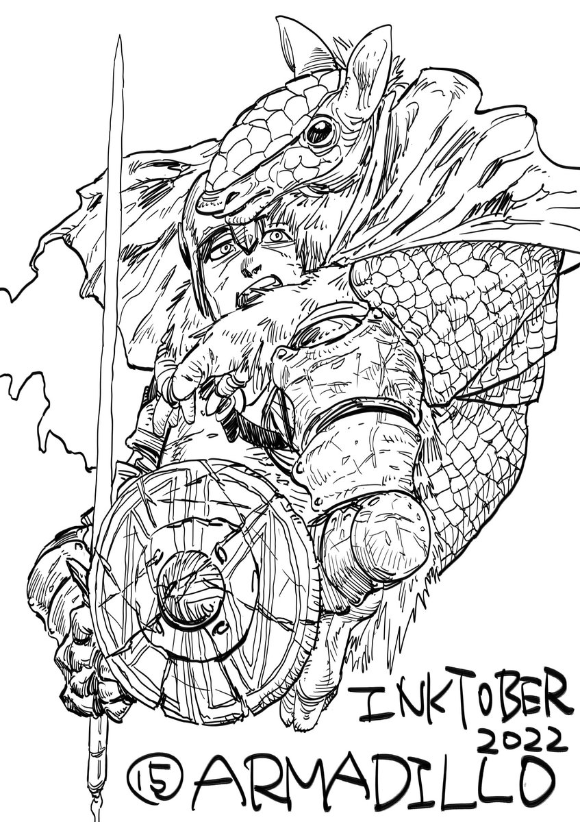 インクトーバー2022、15日目のお題はArmadillo(アルマジロ)。アルマジロちゃんに背中預ける騎士にしました。なんか2日前くらいにもおんぶネタやったねっ。 #インクトーバー #inktober #inktober2022 #騎士 #KnightArt #これで折り返し