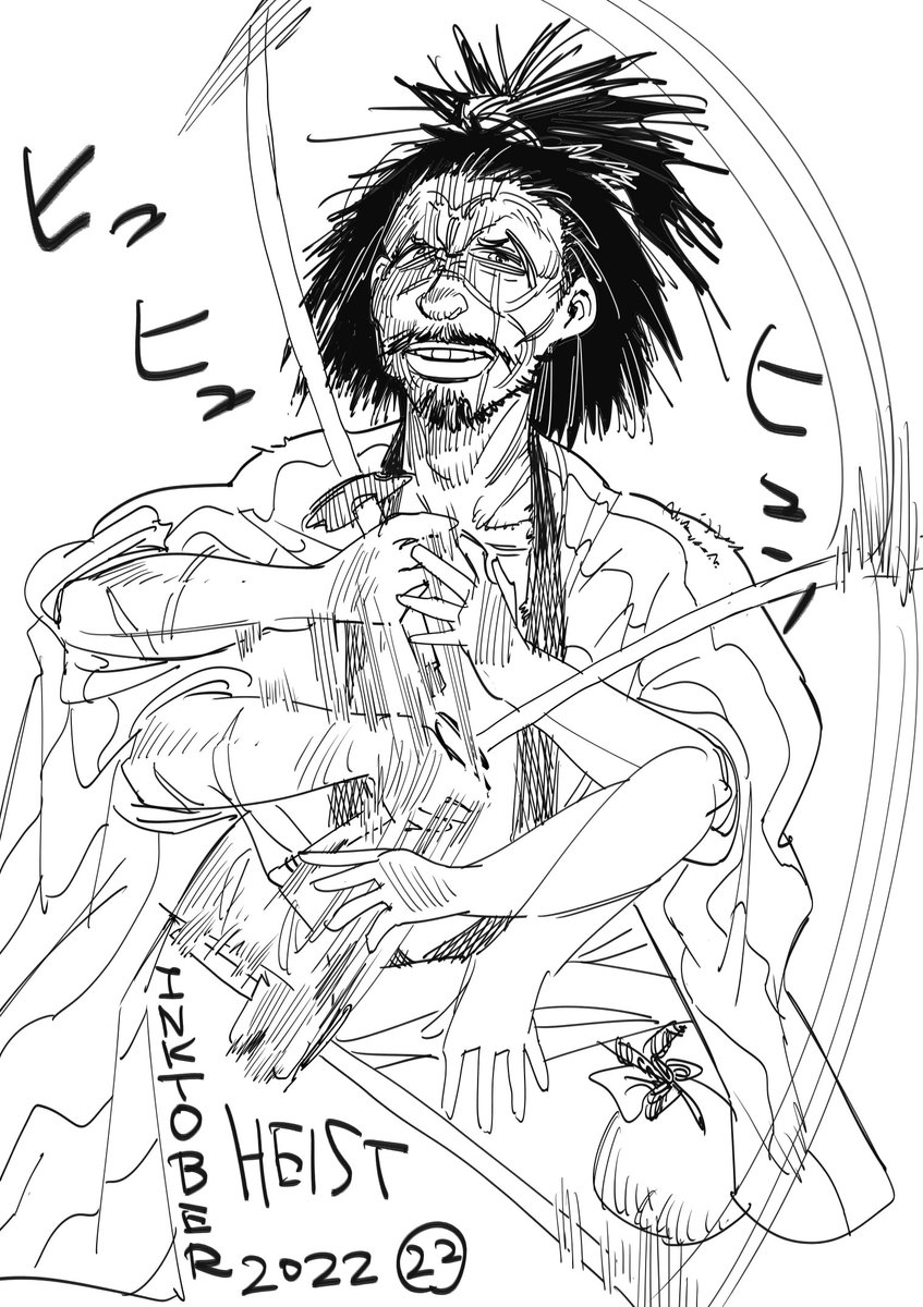 インクトーバー22日めのお題はheist(強盗)。剣捌きで圧かけてくるタイプの野党。 #インクトーバー #inktober #inktober2022day22 #Heist #このあとあっさり斬られます
