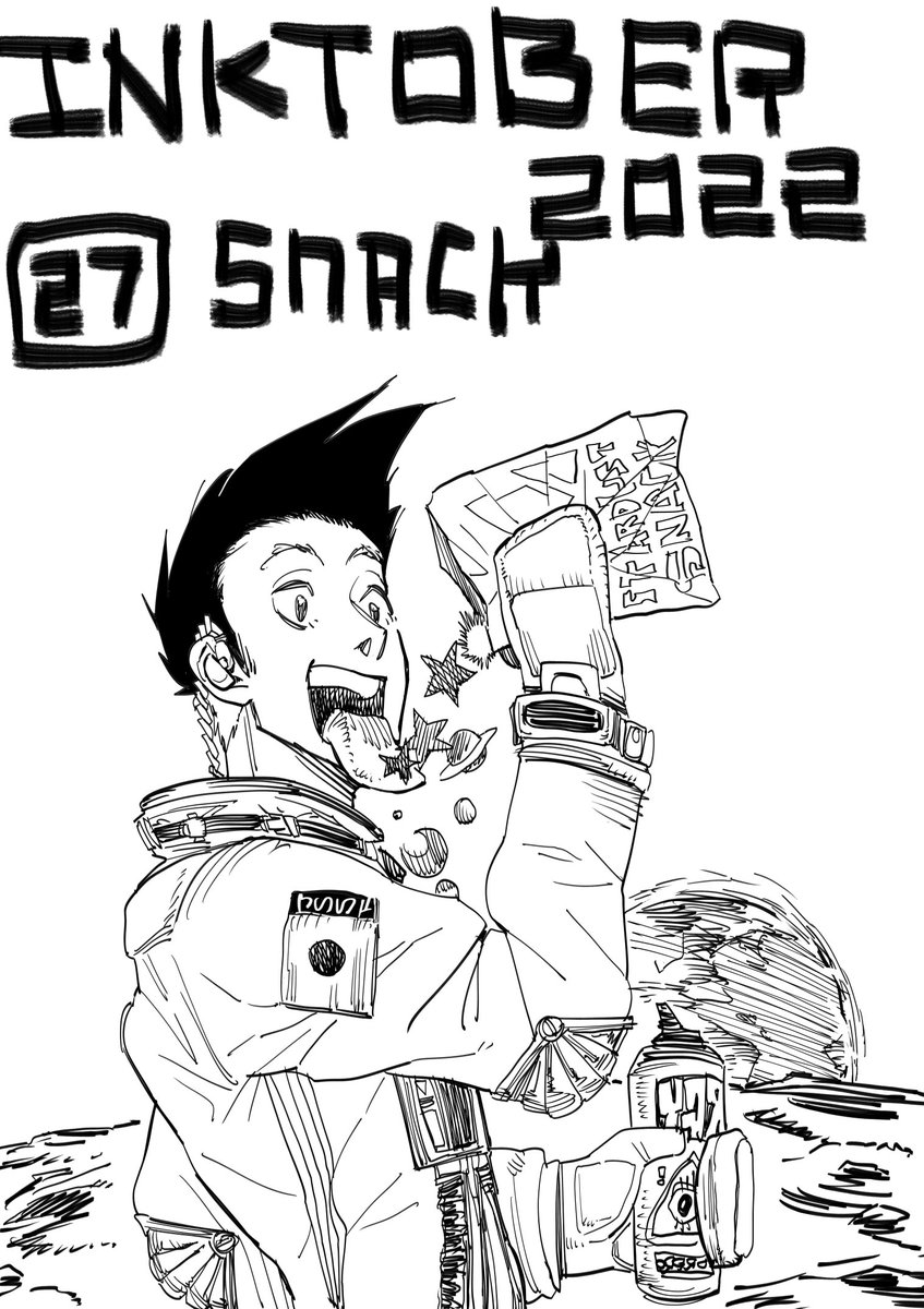 インクトーバー、今日のお題はsnack(スナック)。星屑スナックを食べる宇宙飛行士のCM。…いやお題ムズいって! #inktober #inktober2022 #インクトーバー #snack #スナック #明日のお題は簡単であれ