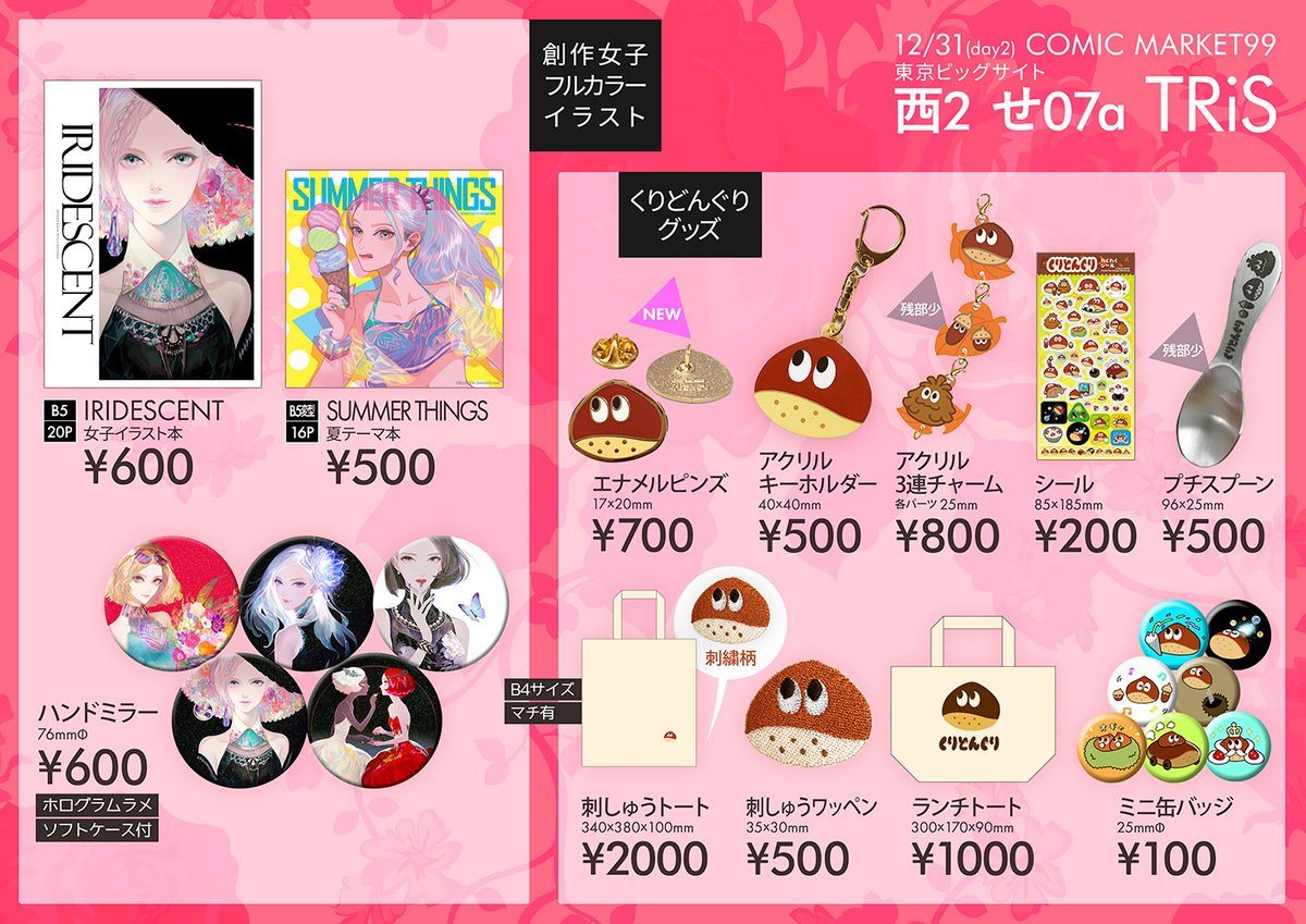 #コミティア144お品書き 5/5 東2【K04a】TRiS イラスト集と #くりどんぐり グッズ頒布します。 美女と栗屋と呼ばれている謎のごった煮サークルです よろしくお願いします🌸🌰 #COMITIA144 #コミティア144
