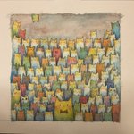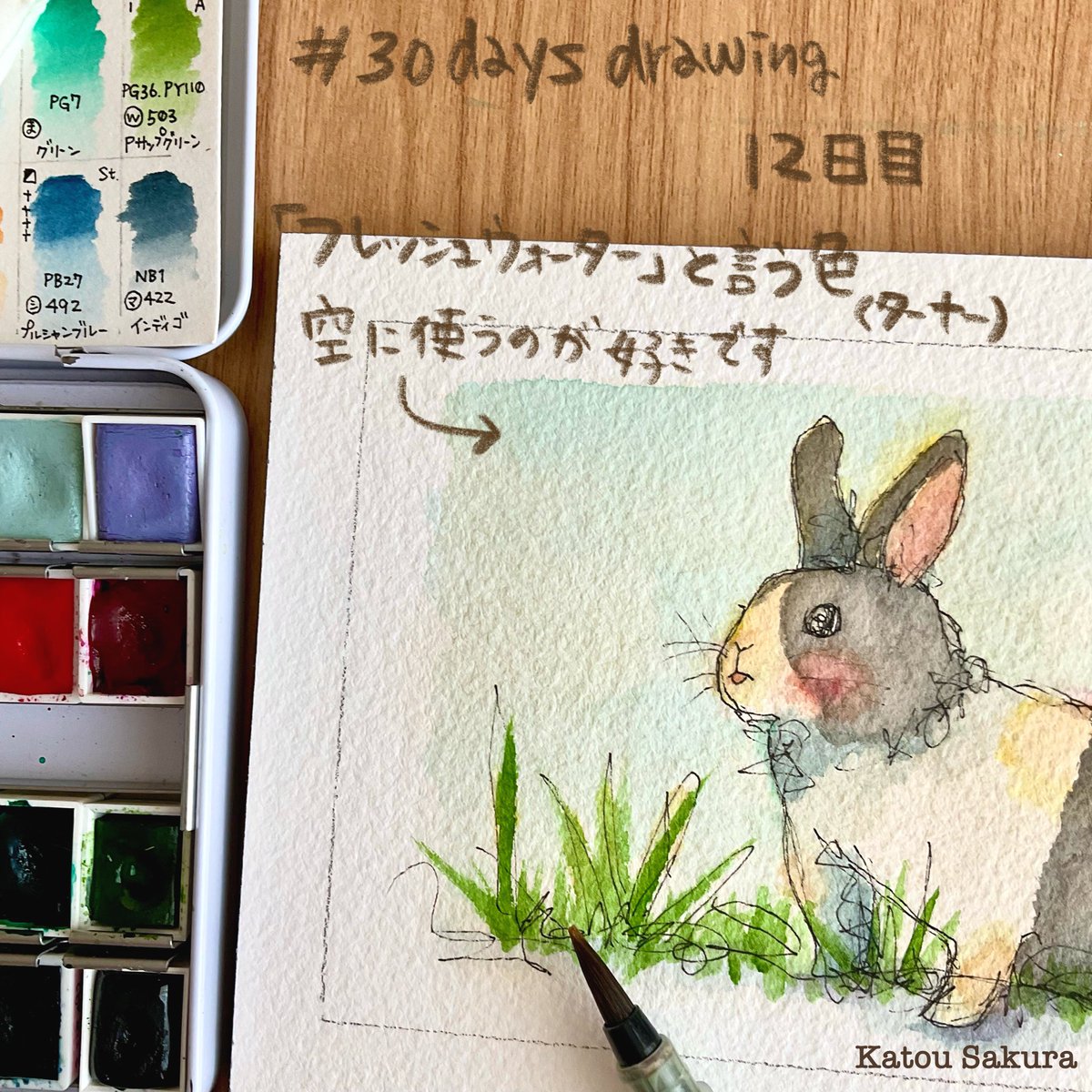 #30daysdrawing 9/5 イエロー、イエローオーカー、マゼンタ、ブラウン、ブルー、ウルトラマリン 昨日と同じ6色で、うさぎに乗った子うさぎももを描きました🐇🐰 目隠し役は子うさぎみみです🐰
