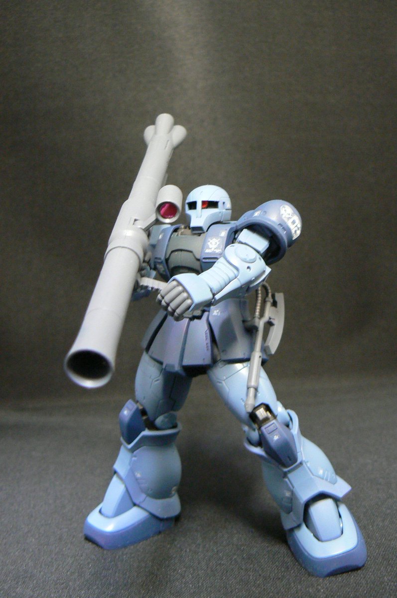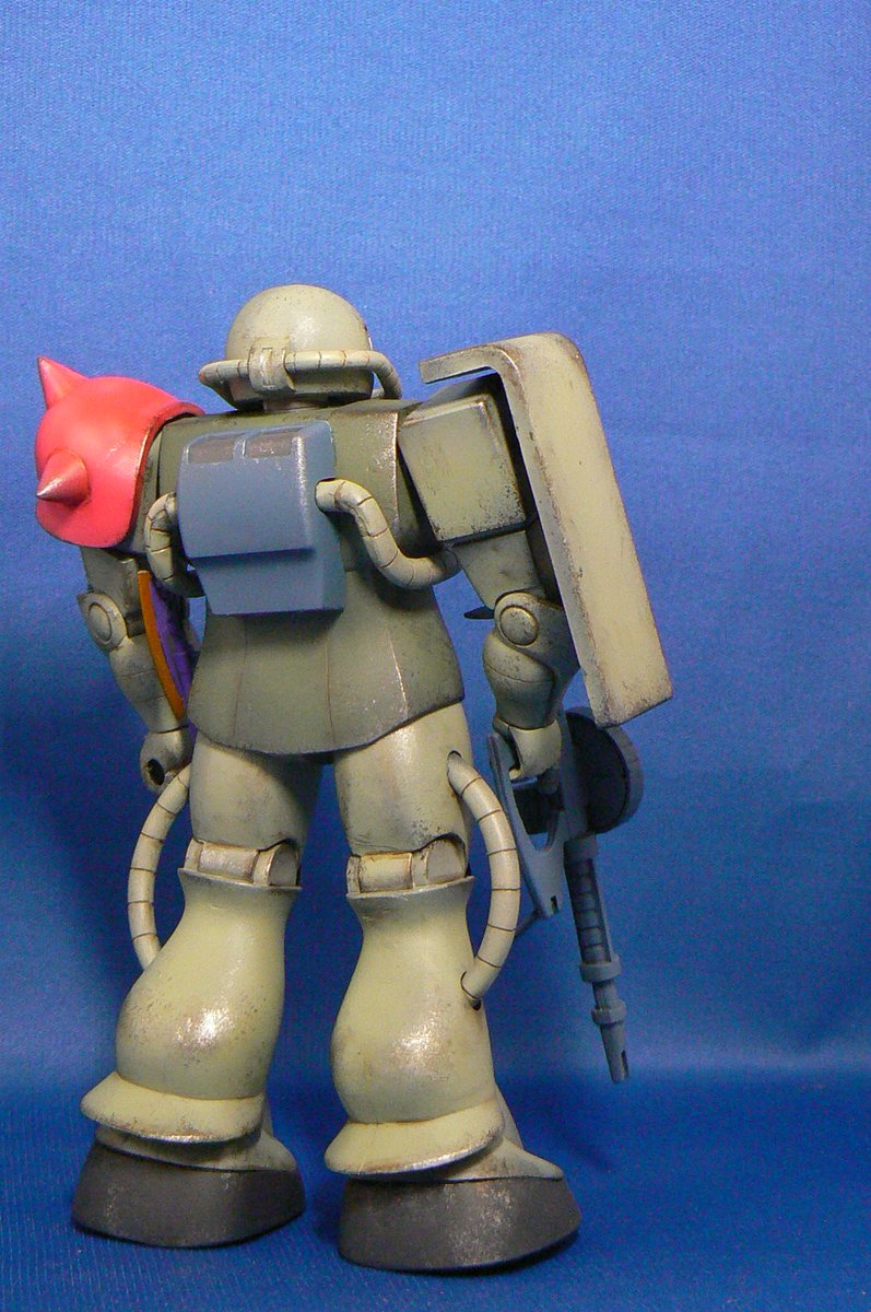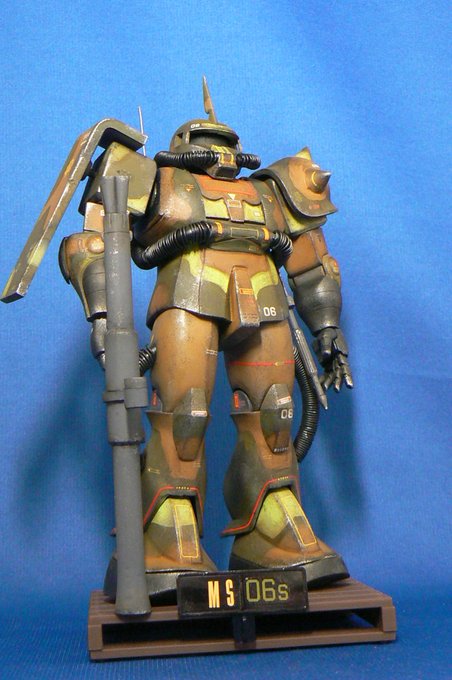 1/100 MS-06 リアルタイプ・ザク 迷彩塗装タイプで完成! 廃ランナーと真鍮線でアンテナを追加しました。 バズーカを持たせると重さでハンドパーツが外れるので 台座で支えるスタイルです。(;^_^A #旧キット14日間戦争祭 #ガンプラ #旧キット