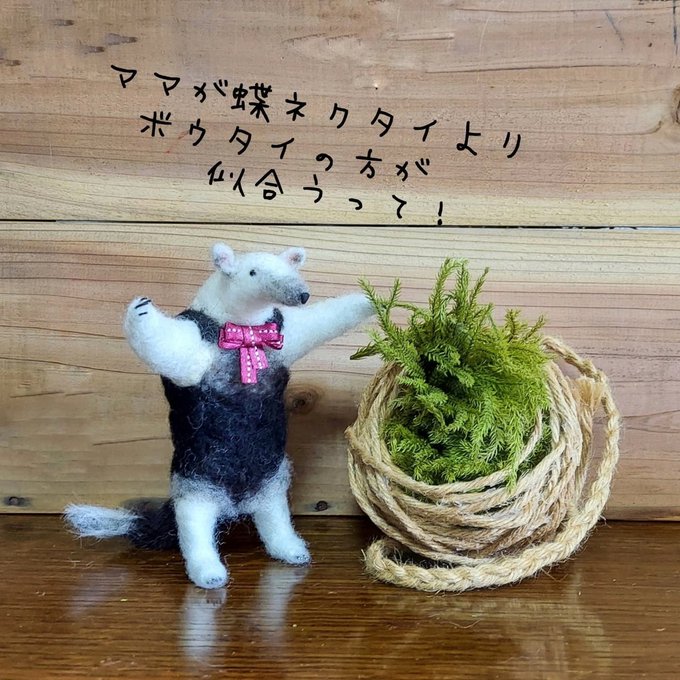 ミナミコアリクイ君大きくなったのでボウタイを着けてもらいました😅 ③赤ちゃんだった頃着けたかったもんね😔(以前ポスト写真) #羊毛フェルト #羊毛フェルト作品 #ミナミコアリクイ #ハンドメイド #needlefelting #needlefelt #woolfelt #handmade instagr.am/p/CWw1a07Ld29/